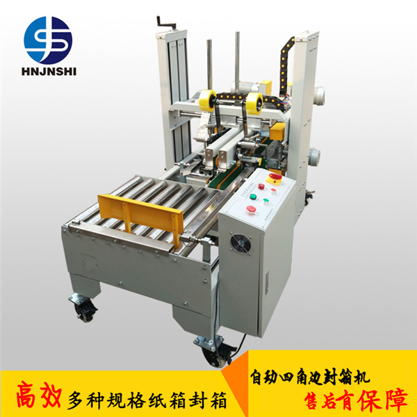 紙箱除了上下封口之外,能把四條角邊都用膠帶封住的機(jī)器就叫四角邊封箱機(jī)。經(jīng)濟(jì)快速、操作容易、保養(yǎng)簡(jiǎn)單,隨意調(diào)校不同大小的紙箱,紙箱包裝堅(jiān)固耐用,適合全天候大量使用。封箱平整、規(guī)范、美觀(guān),同時(shí)完四個(gè)邊的封箱動(dòng)作。該款角邊封箱機(jī)采用特殊設(shè)計(jì),耐用、安全、故障率最低為主,膠帶粘貼,撫平,整齊美觀(guān)。用印字膠帶,更可提高新產(chǎn)品形象。 可一次完成角邊上下封箱動(dòng)作,即可單機(jī)作業(yè),也可以與流水線(xiàn)配套使用。通常和一字型封箱機(jī)搭配使用,通過(guò)轉(zhuǎn)換角度,從而完成工字型封箱和井字型封箱。所以,也有人稱(chēng)其為工字型封箱機(jī)。